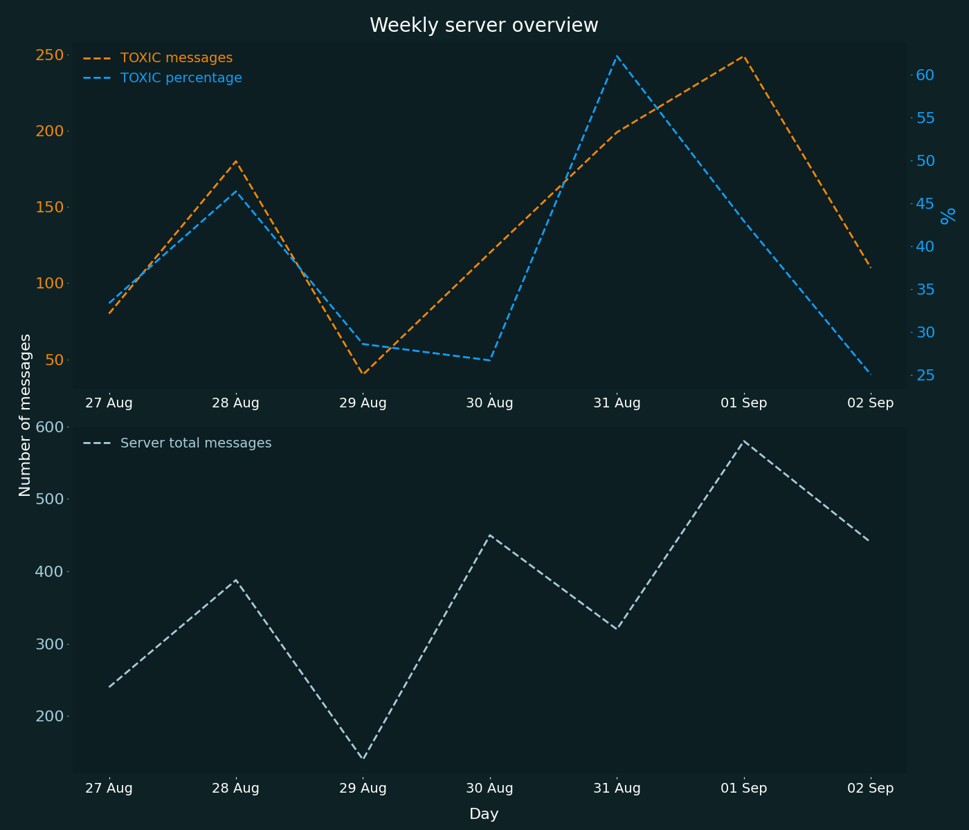 Get Server Insights The Oterlu Bot can also generate reports on what abuse is happening on your server and who is causing the most disruptions. There are commands to check specific users and channels for the % of messages that were labeled as abusive, as well as a weekly report of your communities health.